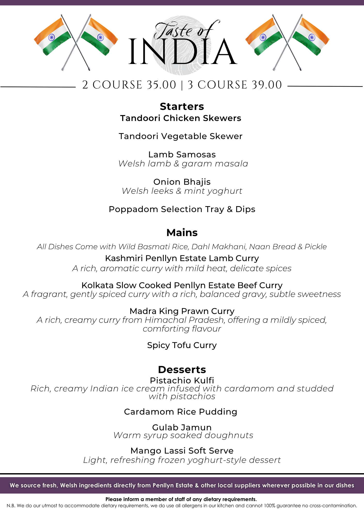 For one weekend only, our kitchen will be serving a unique menu inspired by traditional Indian cooking. Expect warming spices, fragrant herbs and bold, comforting dishes that showcase the rich culinary heritage.