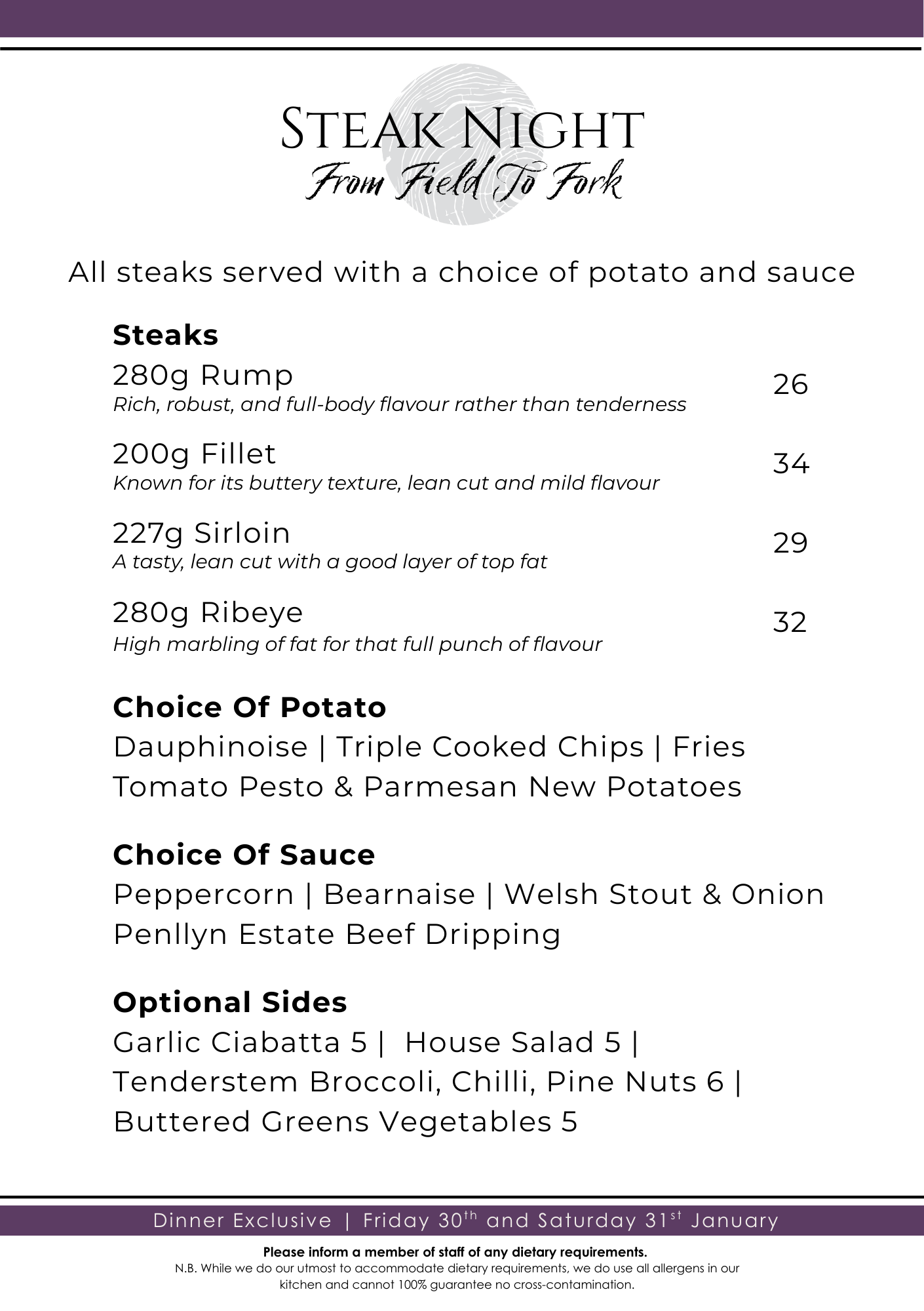 Join us for an evening dedicated to our much-loved steaks, butchered in-house and cooked exactly to your preference. As part of our new monthly evening events, Steak Night is all about great food, a relaxed atmosphere, and a memorable night out.